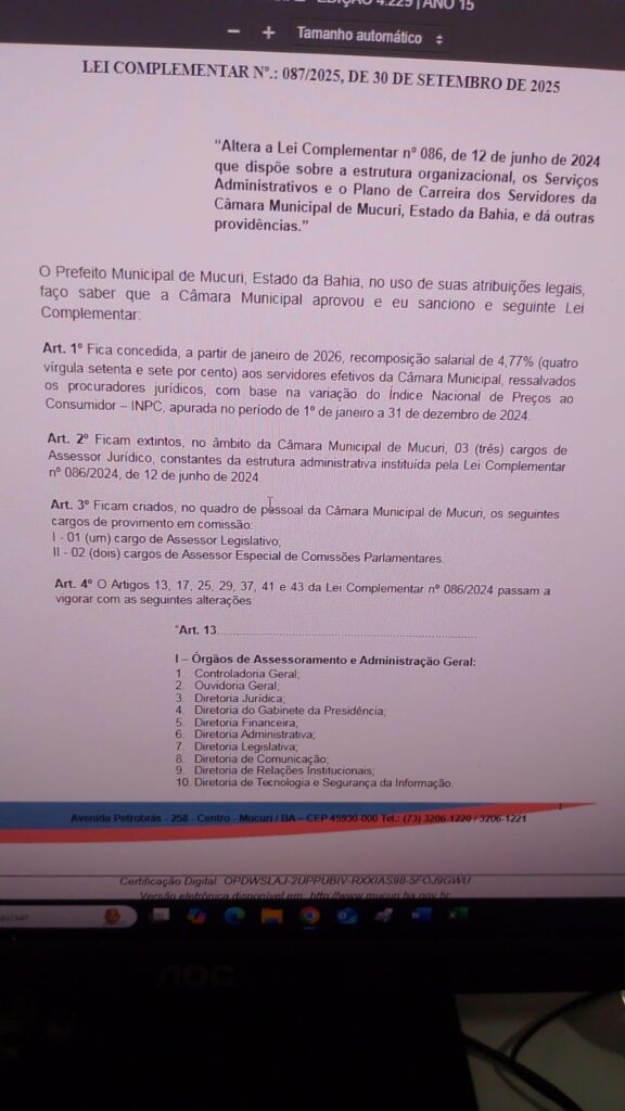 Entre as medidas, está o reajuste de 4,77% nos salários dos servidores do Legislativo a partir de janeiro de 2026, além da extinção de cargos jurídicos para substituição por novas funções comissionadas, como o de Assessor Legislativo e Assessor Especial de Comissões Parlamentares. Esses cargos de confiança, geralmente preenchidos por indicações políticas, representam aumento expressivo nos custos do Parlamento municipal.