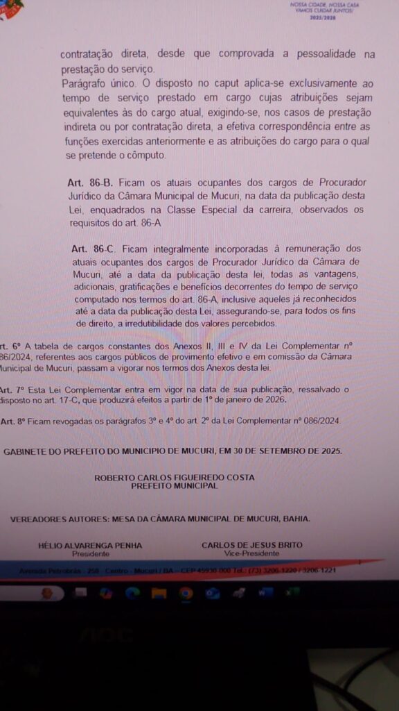 A cidade de Mucuri vive um cenário de contradições. Poucos dias após o prefeito Roberto Carlos Figueiredo Costa afirmar que o município enfrenta uma grave crise financeira, com dívidas bilionárias e risco de colapso nos serviços públicos, a Câmara Municipal aprovou a Lei Complementar nº 087/2025, que cria cargos, promove reajustes e amplia os gastos com a folha de pagamento.