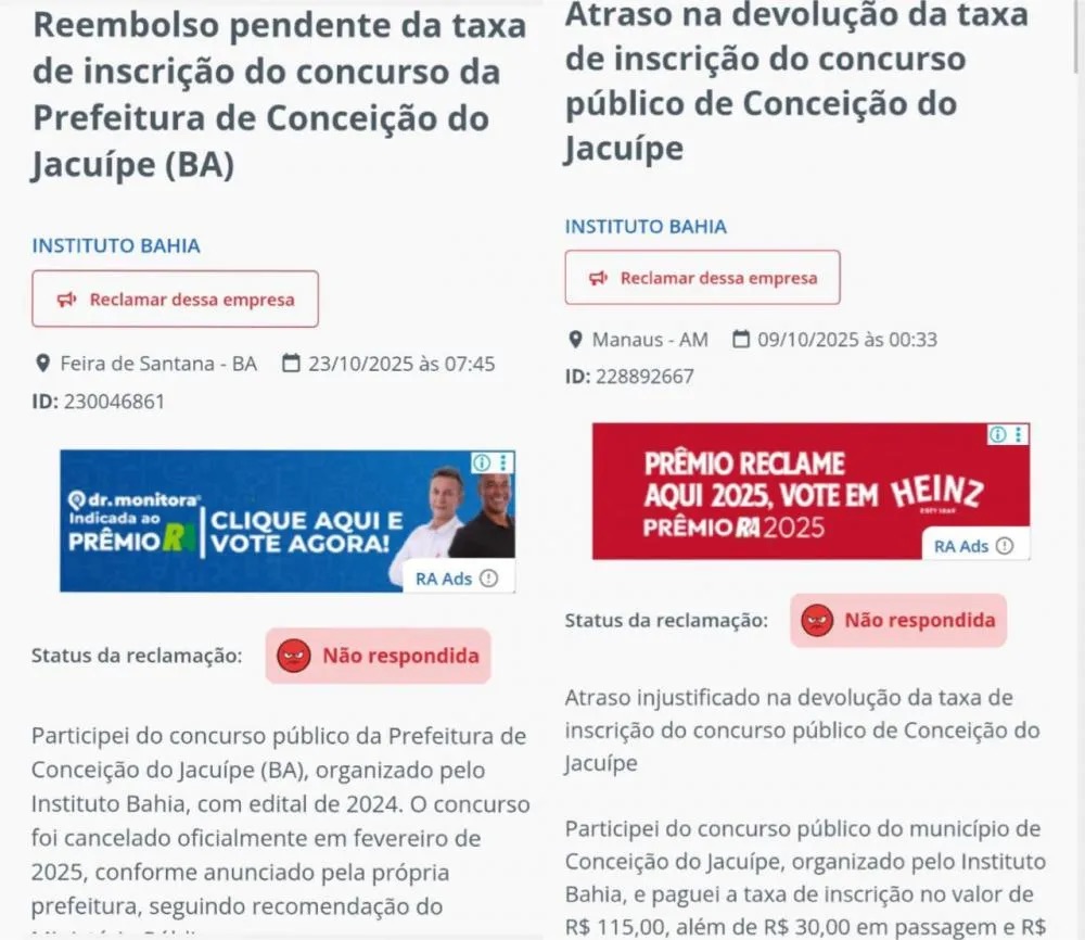 Após o cancelamento do concurso público da cidade de Conceição do Jacuipe em fevereiro de 2025, por conta de um festival de fraudes e irregularidades investigadas pelo Ministério Público da Bahia (MP-BA),  os candidatos, já desiludidos, foram jogados em um abismo ainda maior, o calote milionário ou seja, mais de R$ 2,4 milhões de Reais arrecadados em taxas de inscrição simplesmente “desapareceram”, e passados os 60 dias prometidos para o reembolso, o Instituto se mantém em um silêncio ensurdecedor, ignorando o clamor das vítimas e as pilhas de reclamações no site Reclame Aqui.