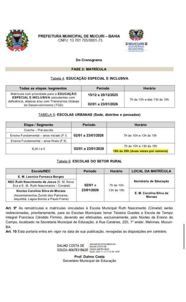 Embora o documento oficial apresente datas, horários e organização das matrículas para o ano letivo de 2026, o que mais gerou indignação entre as famílias foi o trecho que determina que todas as rematrículas e matrículas da antiga Escola Ruth serão redirecionadas para outras instituições, como a Escola Ismar Teixeira Guedes e a Escola de Tempo Integral Francisca Cândido Firmino. Esses procedimentos devem ser feitos exclusivamente no Núcleo de Ensino do Campo, localizado na sede da Secretaria.