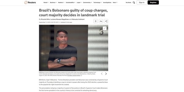 A agência de notícias Reuters afirmou que Bolsonaro está sendo julgado por planejar um golpe para permanecer no poder após perder a eleição de 2022.